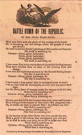 With the passage of the Fugitive Slave Act, all US citizens, even in states that banned slavery, were legally bound to return fugitive slaves to their owners in the South, pushing many who opposed slavery into more radical abolitionism.  Clergyman, James Freeman Clarke, who knew of Julia's published poems, urged her to write a new song for the war effort to replace "John Brown's Body."  The result was a poem, published first in February 1862 in the Atlantic Monthly, and called “Battle Hymn of the Republic” The poem— to a tune originally written by a Southerner for religious revivals—became the best known Civil War song of the North.